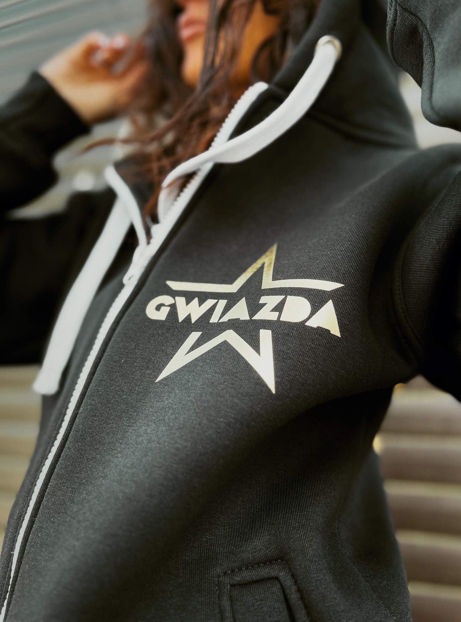 Świetna czarna bluza z kapturem i złotym nadrukim na plecach i piersi, kapturem i kieszeniami i zamkiem, uszyliśmy ją z wysokogatunkowej bawełny z certyfikatami oeko-tex. Kaptur w bluzie jest wypełniony szarą dzianiną aby kontrastował z kolorem bluzy.