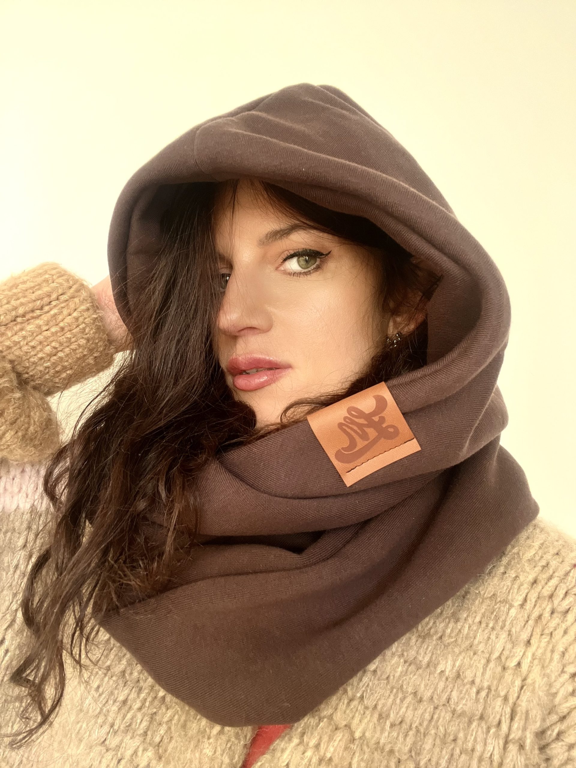 Komin z kapturem brazowy unisex unisex jest uszyty z grubej ocieplanej dzianiny, stanowi cieplutkie okrycie na głowe i szyje , komin przylega szczelnie do szyji dzięki temu jest bardzo ciepły, możesz delikatnie osłonić nim również twarz, niezwykle efektowny i oryginalny pomysł który ożywi każdą stylizację, kaptur po ściągnieciu z głowy służy jako sam komin. Idealny w sezonie zimowym dl;a niej i dla niego. Dzianina i sam produkt powstał w 100% w Polsce.
