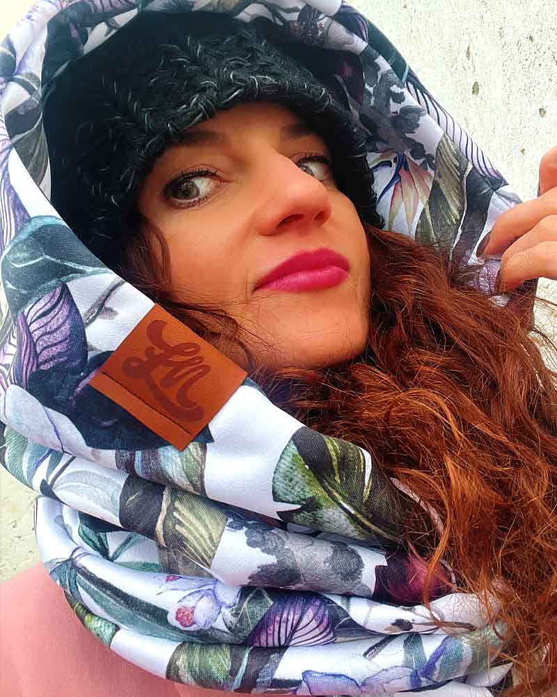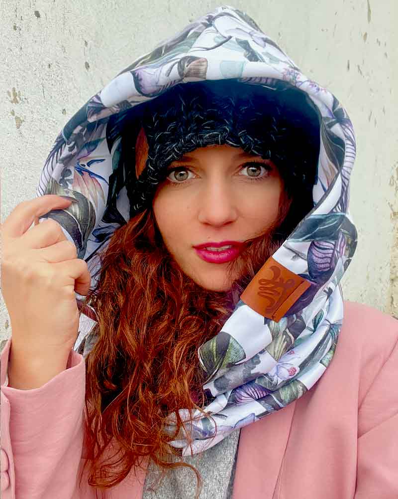 Komin z kapturem hydrofobowy w liście i kwiaty jest uszyty z bardzo grubej ocieplanej dzianiny, stanowi cieplutkie okrycie na głowe i szyje , komin przylega szczelnie do szyji dzięki temu jest bardzo ciepły, możesz delikatnie osłonić nim również twarz, niezwykle efektowny i oryginalny pomysł który ożywi każdą stylizację, kaptur po ściągnieciu z głowy służy jako sam komin. Idealny w sezonie jesiennym i zimowym. Hydrofobowa dzianina nie przepuszcza wody. Dzianina i sam produkt powstał w 100% w Polsce.