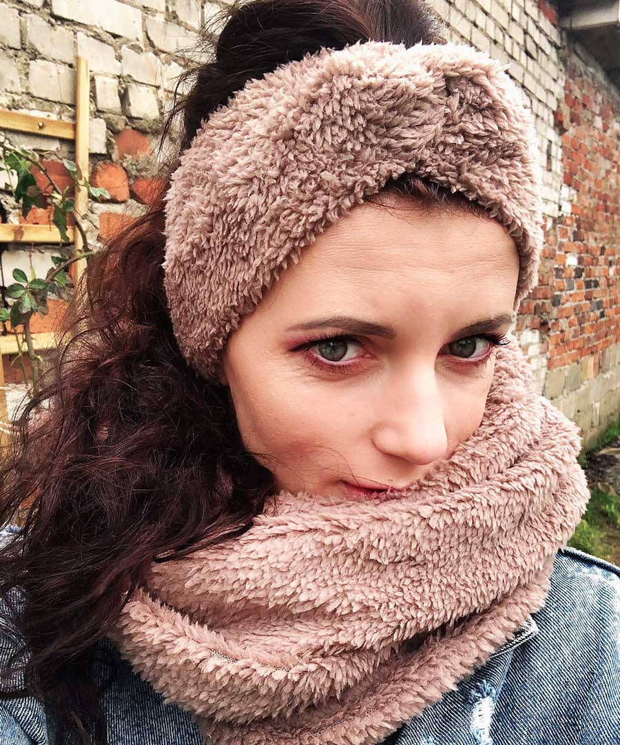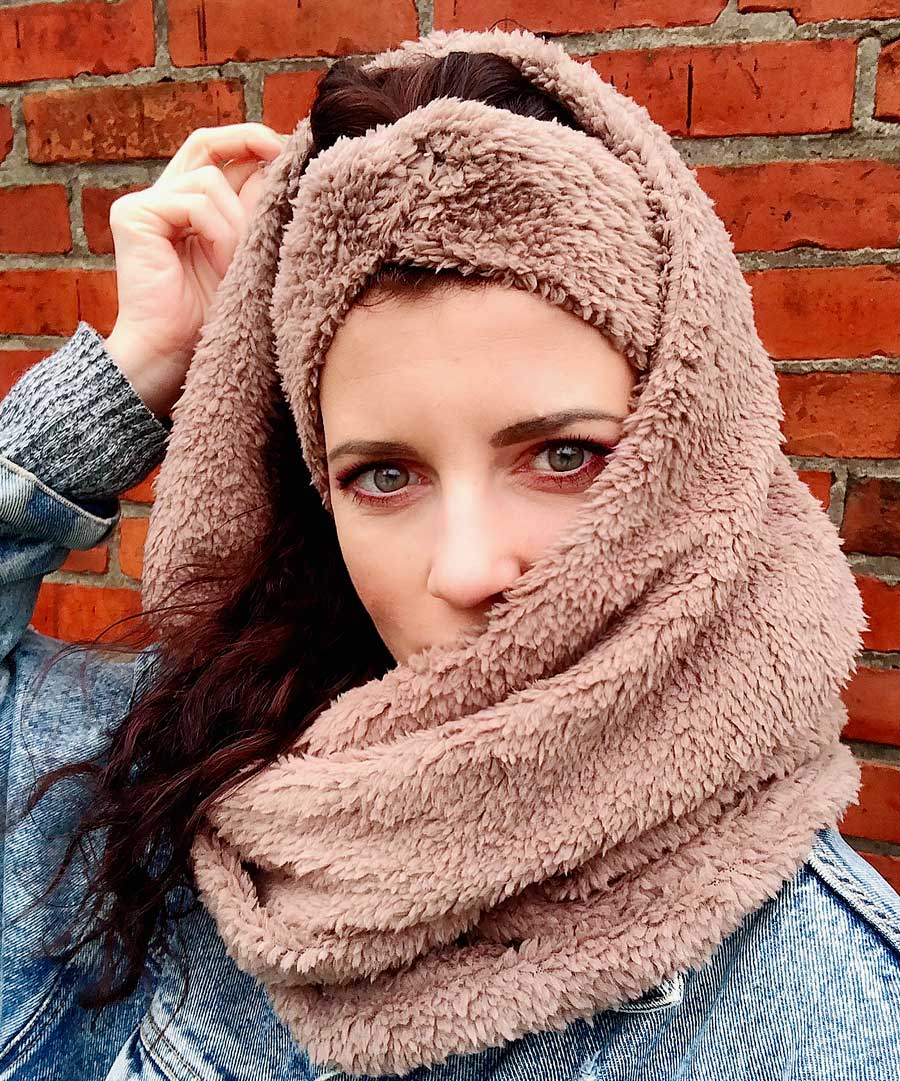 Komin z kapturem Teddy brązowy z opaską jest uszyty z lekkiej i mięciutkiej tkaniny stanowi cieplutkie okrycie na głowe i szyje , komin przylega szczelnie do szyji dzięki temu jest bardzo ciepły, możesz delikatnie osłonić nim również twarz, niezwykle efektowny i oryginalny pomysł który ożywi każdą stylizację, kaptur po ściągnieciu z głowy służy jako sam komin. Idealny w sezonie zimowym. Dzianina i sam produkt powstał w 100% w Polsce.