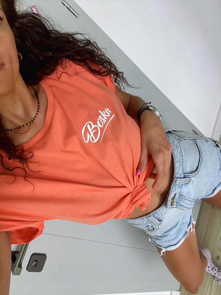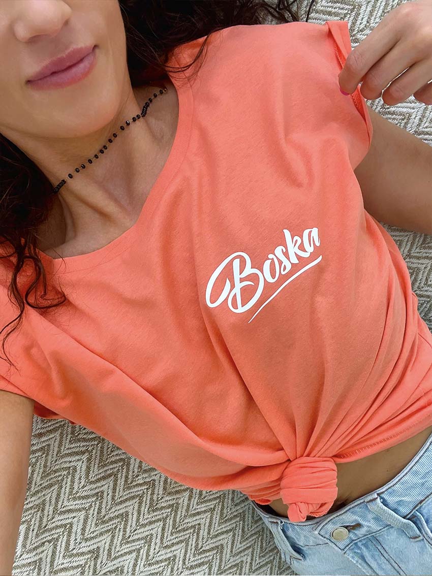 Koralowa damska koszulka z nadrukiem Boska Metki Łap Nas wszyte w karczek i szew boczny. Tył gładki
