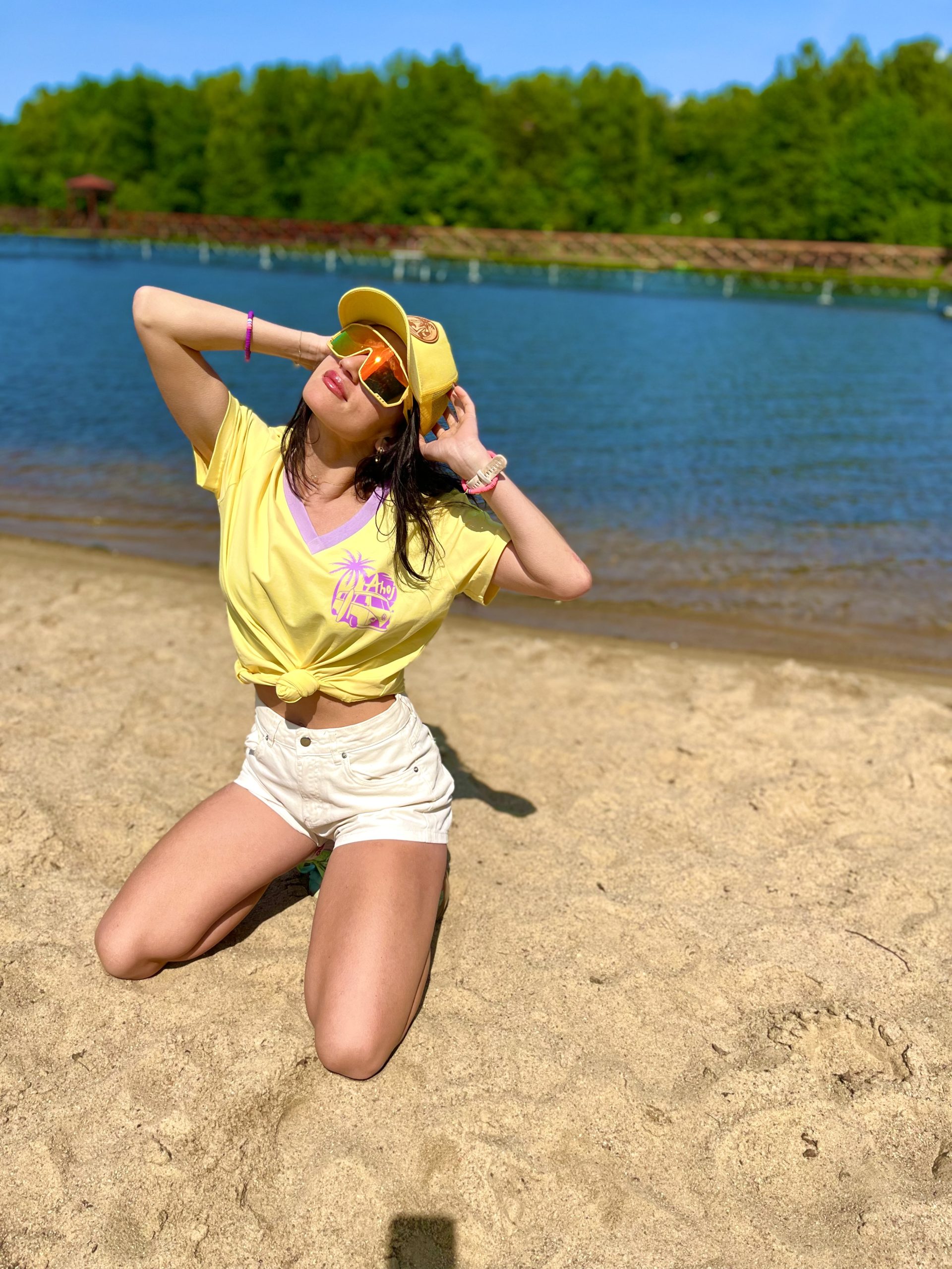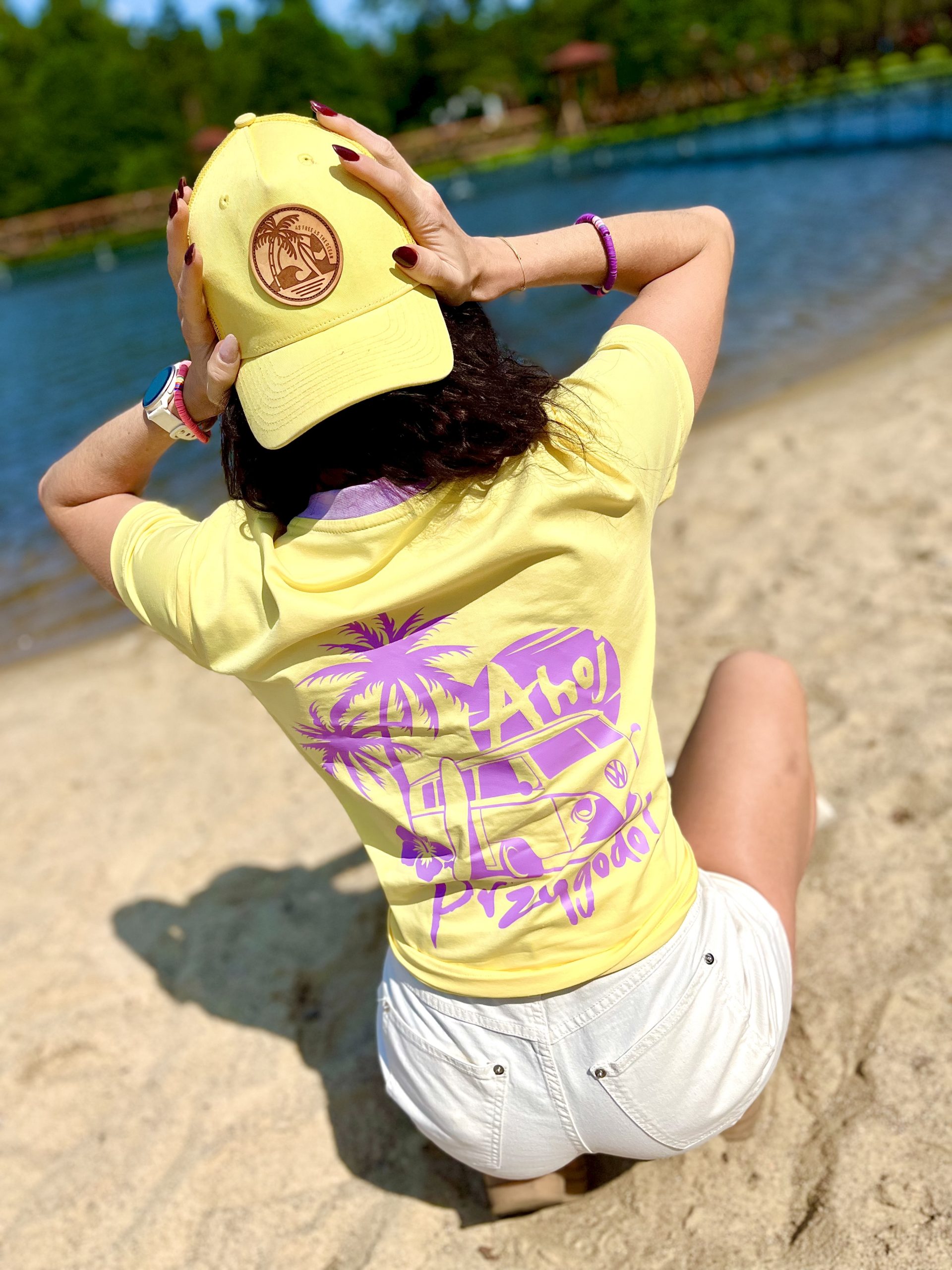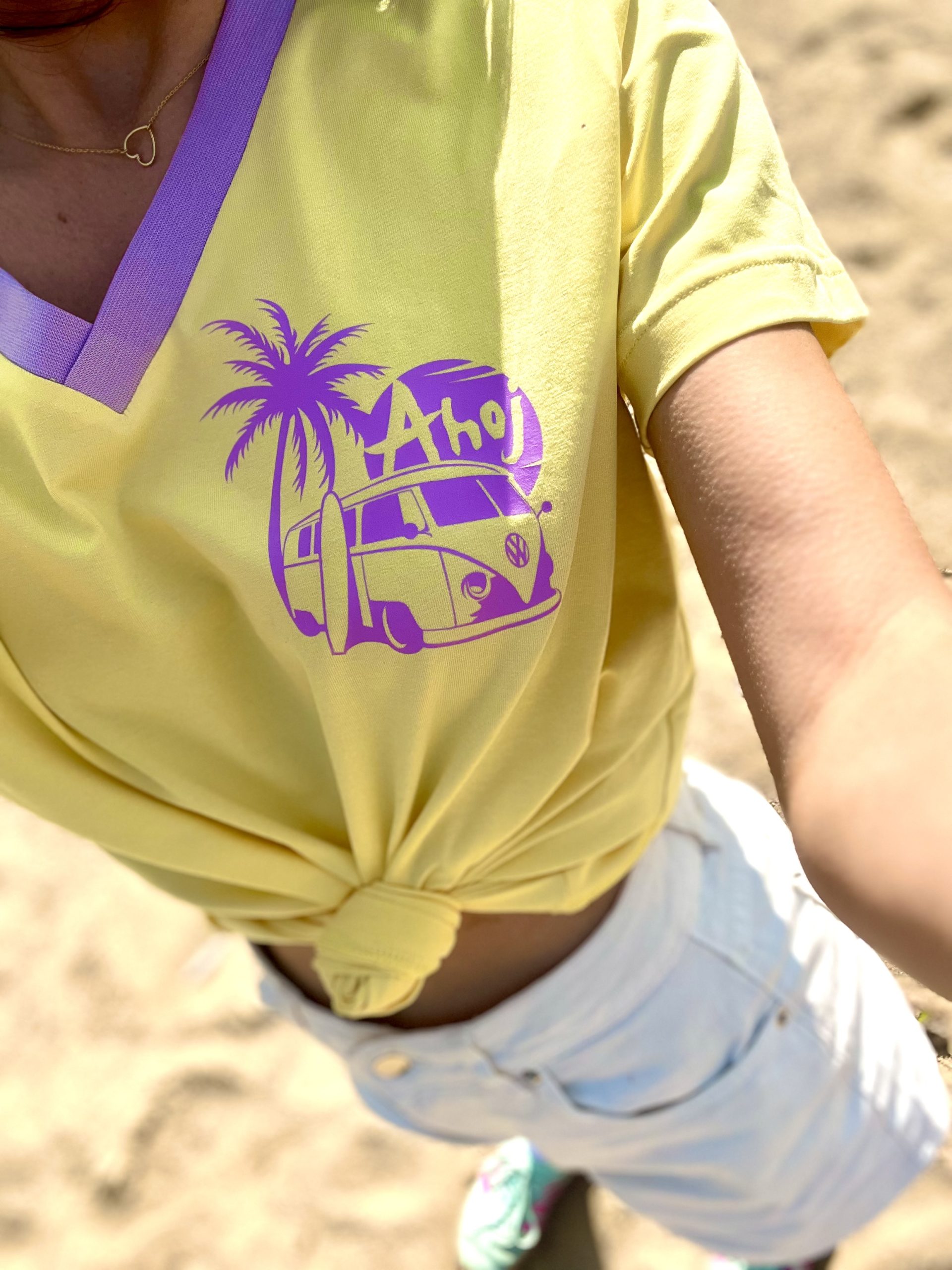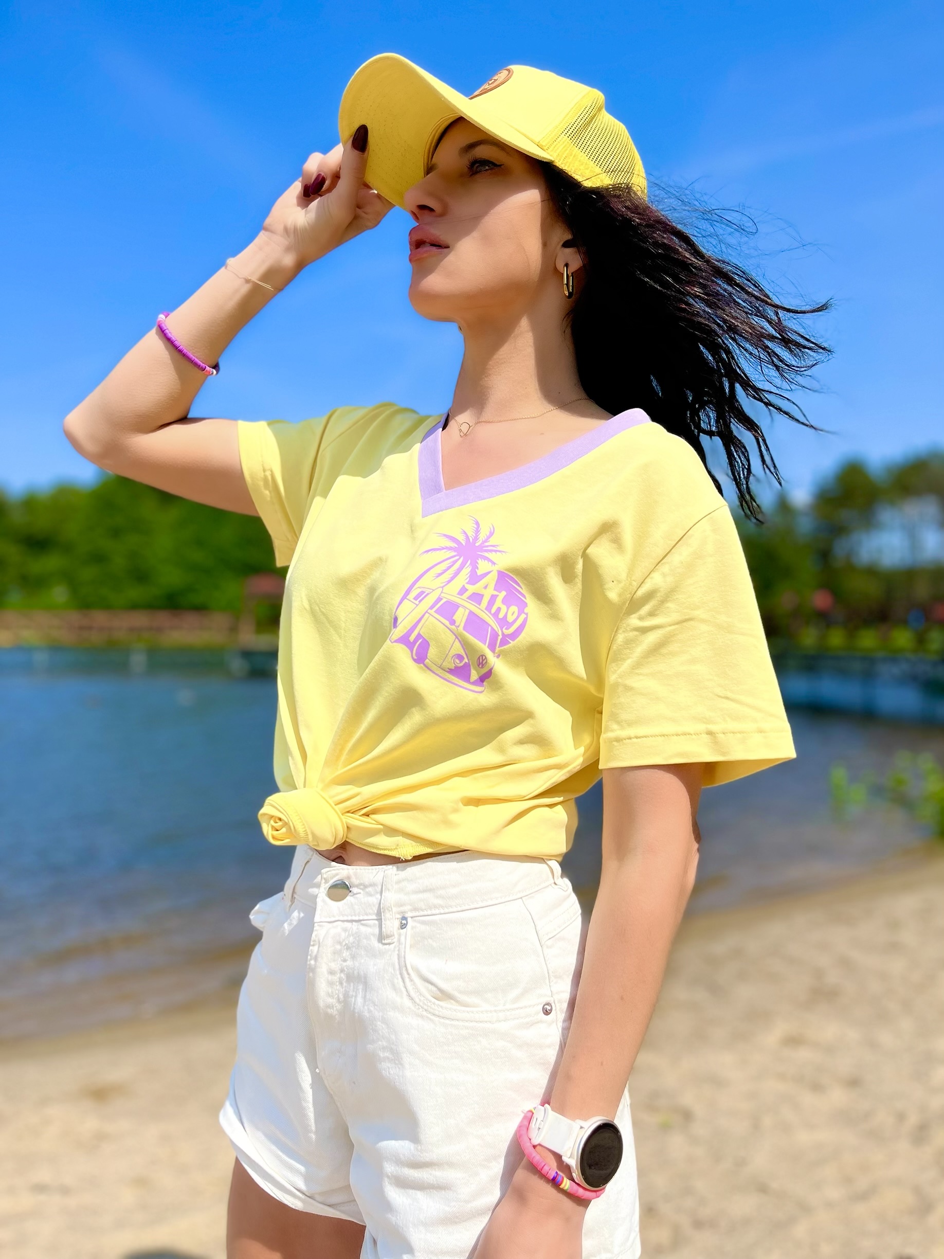 Żółta Koszulka damska dekolt v neck Ahoj Przygodo , świetny tshirt damski w pięknym słonecznym kolorze idealny na wiosnę i lato, mały nadruk na piersi i tył gładki krój v-neck pięknie wysmukla szyje i wydłuża całą sylwetkę,